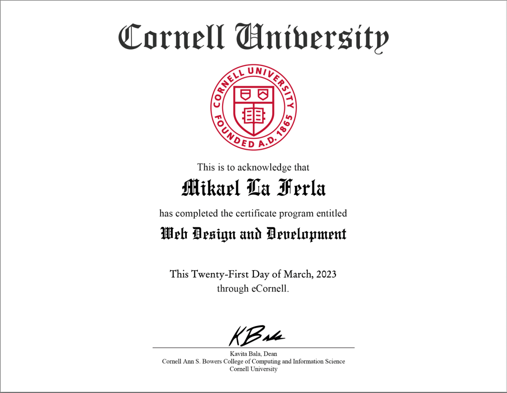 Mikael La Ferla’s Cornell University Web Design and Development Certificate